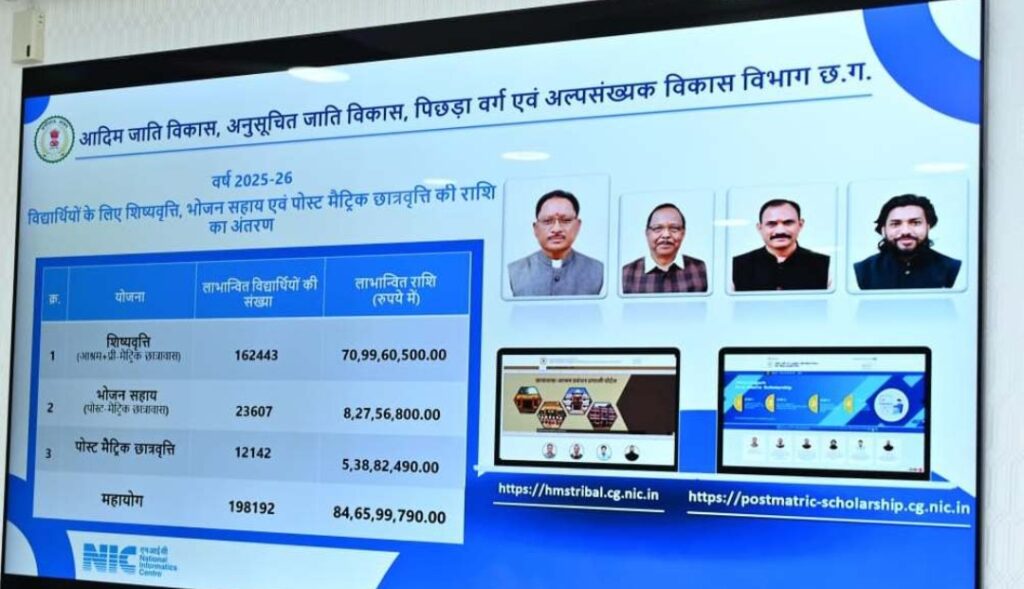 प्रमुख सचिव श्री बोरा ने बताया कि विद्यार्थियों को शिष्यवृत्ति और छात्रवृत्ति ऑनलाईन भुगतान की शुरूआत मुख्यमंत्री श्री विष्णुदेव साय के हाथों पहली बार 10 जून 2025 को की गई थी। राज्य में संचालित सभी प्री. मैट्रिक छात्रावास एवं आश्रमों को शैक्षणिक सत्र प्रारंभ होने के पूर्व ही शिष्यवृति की प्रथम किश्त राशि 77 करोड़ रूपए एवं पोस्ट मैट्रिक छात्रावासों में अध्ययनरत छात्रों हेतु भोजन सहाय की प्रथम किश्त के रूप में राशि 8.93 करोड़ रूपए, इस प्रकार कुल 85 करोड़ रूपए की राशि जारी कर एक अभिनव पहल की गई थी। साथ ही इसके दूसरे चरण में 17 जून 2025 को 8370 विद्यार्थियों को छात्रवृति की राशि 6.2 करोड़ रूपए का ऑनलाइन अंतरण किया गया था।