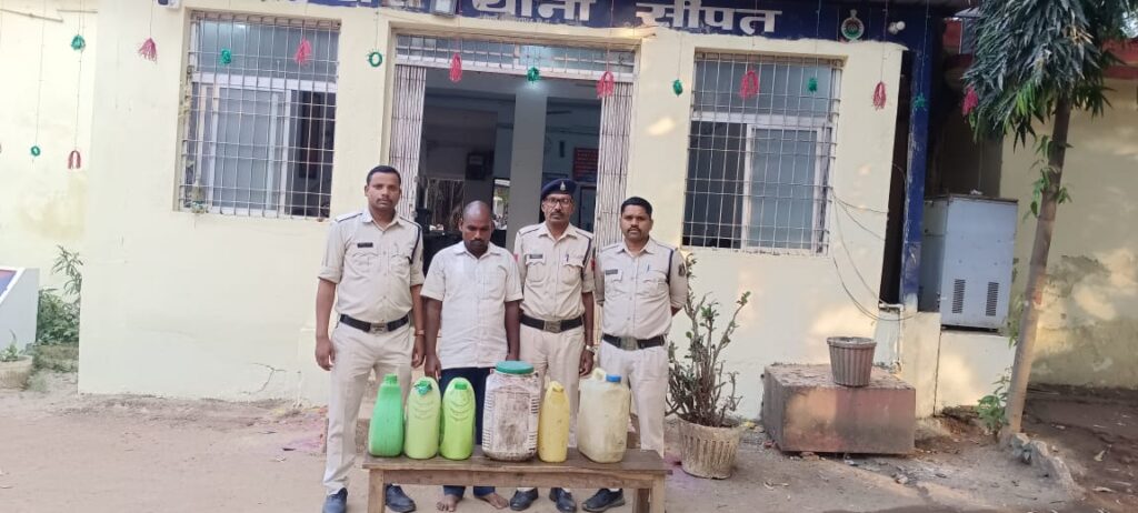 आशीष कश्यप बिलासपुर :-पुलिस अधीक्षक महोदय जिला बिलासपुर श्री रजनेश सिंह के द्वारा लगातार अवैध नशे के विरुद्ध कड़ी कार्रवाई करने का निर्देश दिया गया है। इसी परिप्रेक्ष्य में दिनांक 01.11.2024 को थाना सीपत के द्वारा टाउन पेट्रोलिंग के दौरान जरिये मुखबीर से सूचना मिली कि ग्राम भिल्मी में एक व्यक्ति भारी मात्रा में कच्ची महुआ शराब रखा है। सूचना पर सीपत थाना प्रभारी व टीम द्वारा तत्काल रेड कार्यवाही किया गया, जहां आरोपी विक्रम यादव पिता जेठू राम यादव उम्र 42 साल निवासी ग्राम भिल्मी थाना सीपत जिला बिलासपुर छ0ग0 के कब्जे से 45 लीटर देषी महुआ कच्ची शराब कीमती 9000 रूपये को जप्त कर कब्जा पुलिस लिया गया है। आरोपी के विरुद्ध वजह सबूत के आधार पर अपराध पंजीबद्ध कर धारा 34(2) आबकारी एक्ट के तहत् कार्यवाही कर गिरफ्तार कर न्यायिक रिमांड पर भेजा गया है।