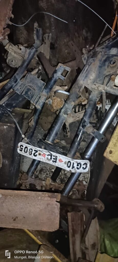 तिजराम साहू ब्यूरो मुंगेली श्रीमान पुलिस अधीक्षक महोदय श्री भोजराम पटेल,अति०पुलिस अधीक्षक श्री पंकज पटेल,अति०पुलिस अधीक्षक श्री विवेक शुक्ला,अति०पुलिस अधीक्षक सुश्री नवनीत छाबड़ा के निर्देशानुसार अनुविभागीय अधिकारी पुलिस श्री एस०एस०आर० घृतलहरे के मार्गदर्शन में थाना मुंगेली क्षेत्र में चल रहे अवैध कबाडी दुकानो की लगातार निगरानी किया जा रहा है कि दिनांक 05.11.2024 मुखबीर की सूचना के आधार पर विजय निषाद पिता पुन्नी राम निषाद उम्र 30 वर्ष साकिन सुभाष वार्ड मुंगेली थाना सिटी कोतवाली मुंगेली के ग्राम कामता रेहुंटा तिराहा के घर बाड़ी में जाकर चेक करने पर एक पुराना मो०सा० किमती 10,000 रूपये, ट्रांस्फार्मर का कटे-फटे सामान, लोहे का एंगल, छड, सटर, ऑटो पार्ट्स का सामान, लोहा एवं अन्य कबाड़ी सामान कुल अनुमानित वजनीय 8-9 क्वींटल जुमला अनुमानित किमती 28,000 रूपये एवं 40 नग इस्तेमाली टायर अनुमानित किमती 3,500 रूपये कुल जुमला किमती 41,500 रूपये को गवाहों के समक्ष जप्त कर कब्जा पुलिस लिया गया। एवं धारा 106 (1) बी.एन.एस.एस के अन्तर्गत इस्तगाशा कायम कर जांच में लिया गया है।
