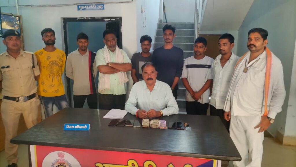 तिजराम साहू ब्यूरो मुंगेली संक्षिप्त विवरण इस प्रकार है दिनाँक 2/11/2024 के रात्रि में मुखबीर से सूचना मिली कि थाना सिटी कोतवाली मुंगेली अंतर्गत ग्राम सुरदा में कुछ लोग 52 पत्ती ताश में रुपए पैसों का हार जीत पर दाव लगा रहे हैं जिसकी सूचना पर श्रीमान पुलिस अधीक्षक भोजराम पटेल के निर्देशन में तत्काल कोतवाली और साइबर सेल की टीम मुखबिर बताएं स्थान पर रवाना हुई जहां जाकर के चारों ओर से घेराबंदी कर छापेमारी की कार्रवाई की गई छापेमारी पश्चात वहां अटल आवास सुरदा के पास कुछ लोग जुआ खेल रहे है कुछ लोग पुलिस को देख भाग गये और कुछ मौके से पकडे गये मौके पर जुआडियान (1)राकेश देवांगन पिता मंतराम देवांगन उम्र 30 साल (2) सुरज देवांगन पिता संतु देवांगन उम्र 27 साल (3)संजय पांडे पिता निहोर पांडे उम्र 30 साल, (4)जेठु साहू उर्फ मन्नू साहू उम्र 27 साल, (5)आशीष शिवहरे पिता दुर्गा शिवहरे उम्र 27 साल, (6) नवाब खान पिता महबुब खान उम्र 50 साल, (7) मन्तोस लहरे पिता टीकाराम लहरे उम्र 27 साल (8) आनंद देवांगन पिता स्व० शत्रुहन देवांगन उम्र 44 साल सभी निवासी मुंगेली को, 52 पत्ती तास से रूपये पैसो का दांव लगाकर अटल आवास के पास सुरदा में हारजीत का काटपत्ती नामक जुआ खेलते पकड़े उनके कब्जे फड एवं पास से नगदी 41400,रूपये, 52 पत्ती तास, एक प्लास्टिक की बोरी फट्टी मिला जिसे समक्ष गवाहान के समक्ष मुता० जप्ती पत्रक के जप्त कर कब्जा पुलिस लिया गया आरोपियों के विरुद्ध छग० जुआ प्रति० अधि0 2022 की धारा 3 (2) के कार्यवाही की गई अवैध कार्यो में लिप्त लोगो के विरुद्ध मुंगेली पुलिस की कार्यवाही लगातार जारी रहेगी उक्त कार्यवाही श्रीमान पुलिस अधीक्षक भोजराम पटेल के निर्देशन एवं अतिरिक्त पुलिस अधीक्षक श्री पंकज पटेल,अतिरिक्त पुलिस अधीक्षक सुश्री नवनीत पाटिल, डीएसपी श्री एस. आर.धृतलहरे के मार्गदर्शन में थाना सिटीकोतवाली और साइबर सेल की द्वारा की गयी।