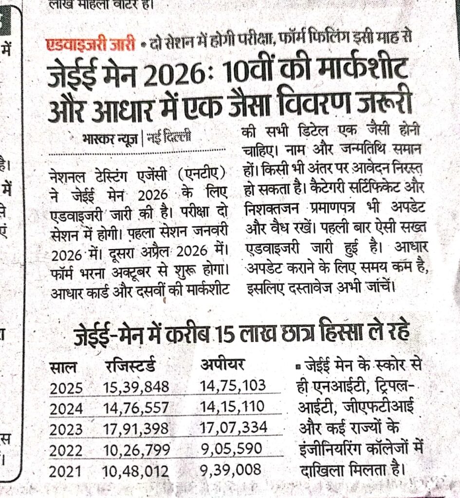 तिजराम साहू ब्यूरो मुंगेली 10 वी की अंक सूची और आधार कार्ड में नाम, पिता का नाम, माता का नाम, जन्म तिथि एक होने पर ही छात्र छात्रा जेईई मेन्स परीक्षा के ऑनलाइन फॉर्म भरने के लिए पात्र होंगे अन्यथा योग्य, प्रतिभावान छात्र छात्रा जेईई मेन्स परीक्षा से वंचित हो जाएंगे।
