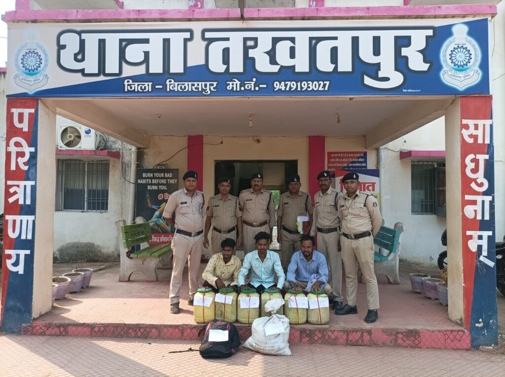 आशीष कश्यप बिलासपुर:-मामले का विवरण इस प्रकार है कि श्रीमान पुलिस अधीक्षक महोदय बिलासपुर द्वारा नशे के विरुद्ध निजात अभियान चलाया जा रहा है, अभियान के तहत पुलिस द्वारा अवैध नशीले पदार्थ विक्रेताओं के ऊपर लगातार कार्रवाई की जा रही है इसी दौरान दिनांक 03.11.2023 को थाना तखतपुर क्षेत्र के अलग-अलग स्थान पर रेड करवाई की गई, तखतपुर पुलिस द्वारा रेड कार्यवाही कर 1. ग्राम समडील खेत में गोपीकिशन वर्मा, 2. ग्राम बीजा में रामचरण कोल, 3. ग्राम शांतिपुर में रमेश मिरी के संयुक्त कब्जे से कुल 118 लीटर महुआ शराब जप्त कर आरोपीगण को धारा 34 (2) आबकारी अधिनियम में गिरफ्तार कर रिमांड पर भेजा गया है ।