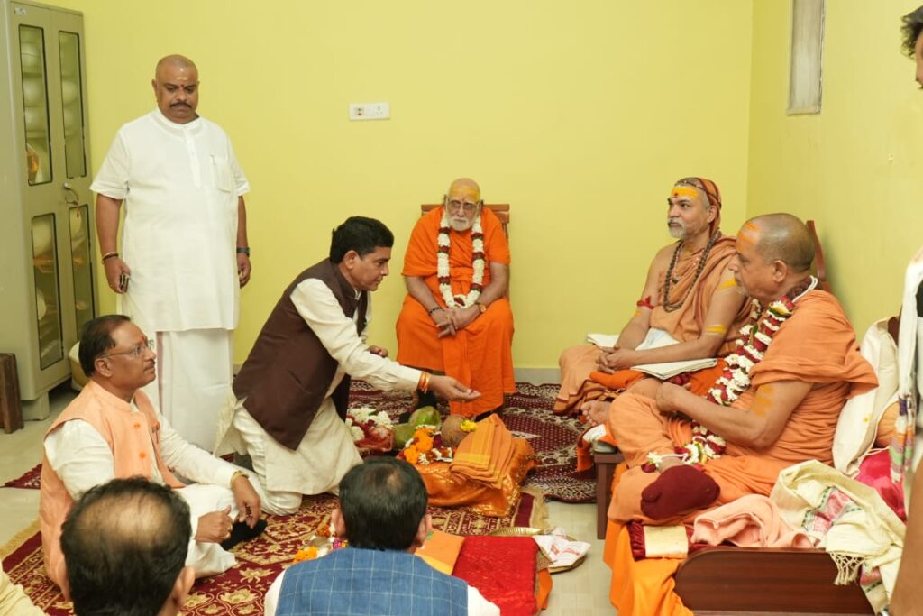 ब्यूरो रायपुर:- जगतगुरु शंकराचार्य स्वामी: अविमुक्तेश्वरानंद सरस्वती “1008” महाराज के छत्तीसगढ़ प्रवास का आज दूसरा दिन हैं शंकराचार्य महाराज जी का आगमन रविवार 03 मार्च को राज्य सरकार के अथिति रूप में रायपुर हुआ जहां आज शंकराचार्य से आशिर्वाद लेने के छत्तीसगढ़ के मुख्यमंत्री विष्णुदेव साय सोमवार सुबह 9 बजे शंकराचार्य आश्रम बोरियाकला पहुंचे मुख्यमंत्री ने द्वारकाशारदापीठाधीश्वर जगद्गुरु शंकराचार्य स्वामिश्री: सदानंद सरस्वती जी महाराज, ज्योतिष्पीठाधीश्वर जगद्गुरु शंकराचार्य स्वामि अविमुक्तेश्वरानंद: सरस्वती महाराज एवं द्विपीठ के निज सचिव ब्रह्मचारी सुबुधानन्द महाराज का दर्शन कर परम्परा के अनुसार शंकराचार्य महाराज के पदुकापुजन करके प्रदेश के खुशहाली के लिए आशीर्वाद मांगा।