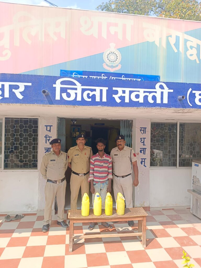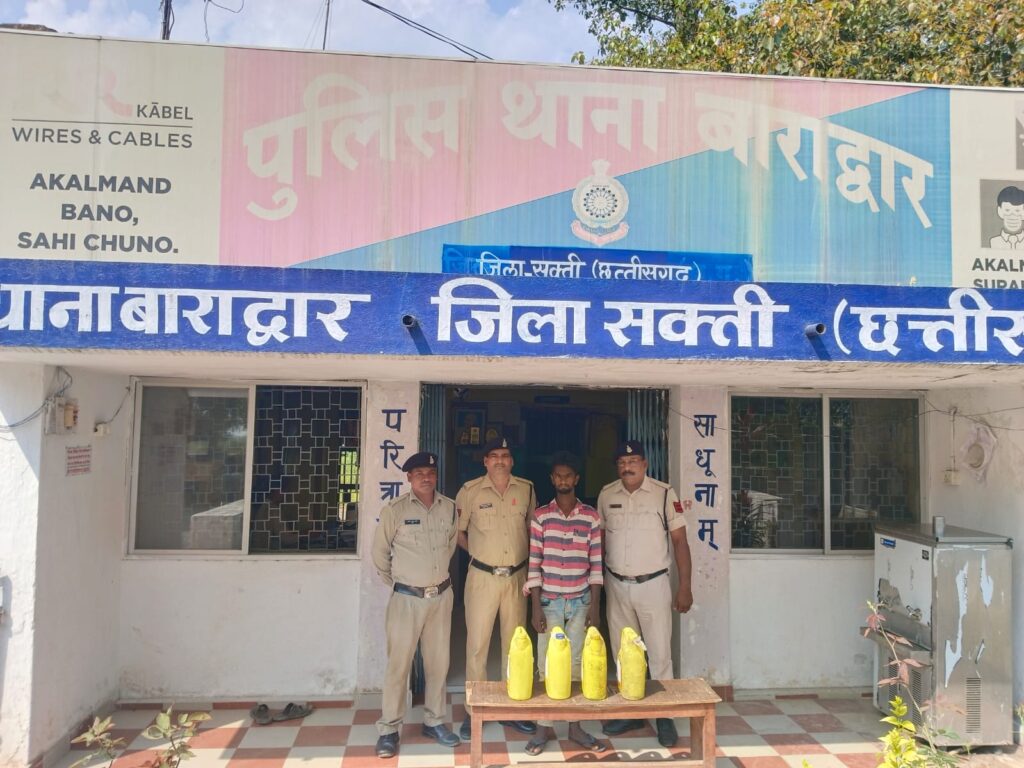 आंनद राठौर ब्यूरो सक्ति…..मामले का विवरण इस प्रकार है कि श्रीमान पुलिस अधीक्षक महोदय द्वारा चुनाव आचार संहिता के दौरान अवैध रूप से श्राब ,जुआ एवं गांजा बिक्री एवं परिवहन पर अंकुश लगाने हेतु निर्देश व अतिरिक्त पुलिस अधीक्षक महोदया श्रीमति गायत्री सिंह, उप पुलिस अधीक्षक महोदया श्रीमति अंजली गुप्ता सक्ती के मार्गदशन पर टीम बनाकर जुर्म जरायम पतासाजी एव माइनर एक्ट कार्यवाही हेतु देहात रवाना हुये थे कि मुखबीर के सुचना मिला की ग्राम रायपुरा भांठापारा बंधवा पार तालाब के किनारे फलेश कुर्रे नाम का व्यक्ति बिक्री के लिए अवैध रूप से कच्ची महुआ शराब रखा हुआ है कि सूचना पर गवाह एवं हमराह स्टाप के साथ घेराबंदी कर रेड कार्यवाही किया जहां पर एक व्यक्ति अवैध रूप से जरिकेनों में कच्ची महुआ शराब रखा हुआ मिला जिससे नाम पता पुछने पर अपना नाम फलेश कुर्रे पिता रामलाल कुर्रे उम्र 20 वर्ष निवासी लवसरा वार्ड नं. 10 थाना बाराद्वार का होना बताया जिसके कब्जे से 05 लीटर क्षमता वाली पीले रंग की 04 नग जरिकेन में प्रत्येक में 5-5 लीटर कुल 20 लीटर कच्ची हाथ भटठी महुआ शराब भरी हुई किमती 2000 रूपये का मिला जिसे आबकारी एक्ट के प्रावधानो के तहत विधिवत कार्यवाही कर गवाहों के समक्ष के आरोपी लखन लाल यादव के कब्जे से जप्त कर कब्जा पुलिस लिया जाकर मौके पर शीलबंद किया गया आरोपी का कृत्य *अपराध धारा 34 (2) आबकारी अधिनियम* का सबुत पाये जाने से आरोपी को गिरफ्तार कर रिमांड पर मान. न्यायालय पेश किया गया।