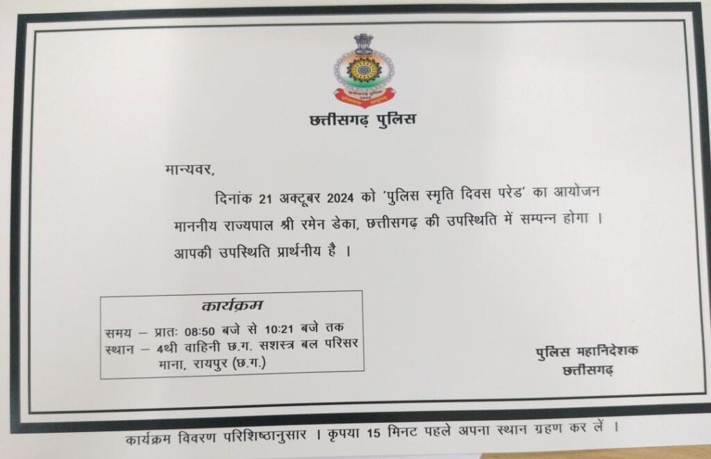 पुलिस महानिदेशक छत्तीसगढ़ से प्राप्त जानकारी के अनुसार कार्यक्रम में मुख्यमंत्री श्री विष्णु देव साय, उपमुख्यमंत्री एवं गृहमंत्री श्री विजय शर्मा भी शामिल होंगे। कार्यक्रम में अतिथिगणों का श्रद्धांजलि उद्बोधन होगा। इस मौके पर सम्पूर्ण भारत में एक सितम्बर 2023 से 31 अगस्त 2024 तक कर्तव्य की बेदी पर शहीद हुए सुरक्षा कर्मियों की नामावली का वाचन तथा अतिथिगणों एवं पुलिस अधिकारियों द्वारा पुष्पांजलि अर्पित की जाएगी। राज्यपाल श्री रमेन डेका इस अवसर पर शहीद पुलिस कर्मियों के परिवारों से मुलाकात करेंगे।