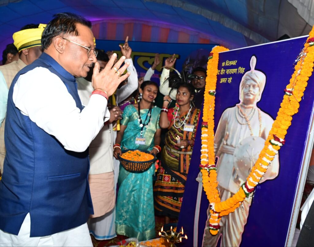 उन्होंने कहा कि शहीद वीर नारायण सिंह जैसे अनेक जनजातीय स्वतंत्रता संग्राम सेनानी हुए है जिन्हे उचित सम्मान नहीं मिल पाया था लेकिन प्रधानमंत्री श्री नरेंद्र मोदी ने जनजाति विभूतियों को सम्मान देने क़ा काम कर रहे है। प्रधानमंत्री ने 15 नवम्बर को जनजातीय गौरव दिवस मनाने क़ी घोषणा क़ी है। विशेष पिछडी जनजाति समुदाय क़े लोगों क़े विकास क़े लिए प्रधानमंत्री जनमन योजना शुरू किया गया है। पीएम ग्राम उत्कर्ष योजना क़े तहत प्रदेश क़े 6 हजार गाँवो को लाभ मिलेगा।मुख्यमंत्री ने कहा कि रायपुर में 9 करोड़ क़ी लागत से शहीद वीर नारायण संग्रहालय का निर्माण किया जा रहा है। आदिवासी बाहुल्य क्षेत्रों में बुनियादी सुविधाओं का विस्तार किया जा रहा है। हमारी सरकार ने एक साल में मोदी क़ी गारंटी क़े तहत अधिकांश वायदे पूरा कर दी है।