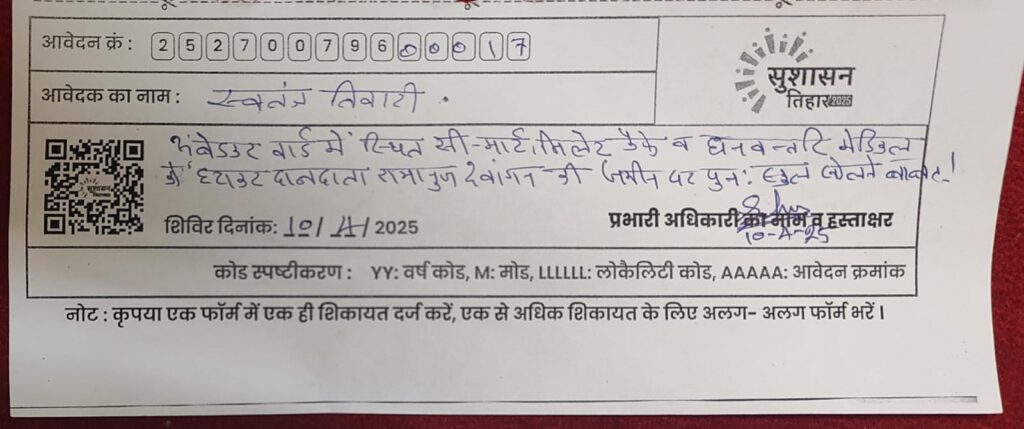 अब देखना यह हैं कि शासन-प्रशासन द्वारा सुशासन तिहार में पहुंचें इस आवेदन पर क्या कार्यवाही किया जाता हैं।