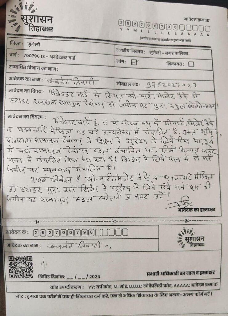 मुंगेली अम्बेडकर वार्ड निवासी अधिवक्ता स्वतंत्र तिवारी ने सुशासन तिहार में आवेदन देते हुए शासन-प्रशासन से मांग किया हैं कि अम्बेडकर वार्ड क्रमांक 13 में गौरव पथ में स्थित सीमार्ट, मिलेट कैफे व धनवन्तरि मेडिकल एक बड़े काम्प्लेक्स में संचालित है, उक्त भूमि दानदाता रामानुज देवांगन ने शिक्षा के उद्देश्य के लिये दिया था, पूर्व में यहां रामानुज देवांगन स्कूल संचालित था, जिसे अन्यत्र जर्जर भवन में संचालित किया जा रहा है। शिक्षा के लिये दान में दी गई जमीन पर व्यवसाय संचालित हैं इसीलिये सी-मार्ट, मिलेट कैफे व धनवन्तरि मेडिकल को हटाकर पुनः वहां शिक्षा के उद्देश्य के लिये दिये गये दान की जमीन पर रामानुज स्कूल खोला जाये।