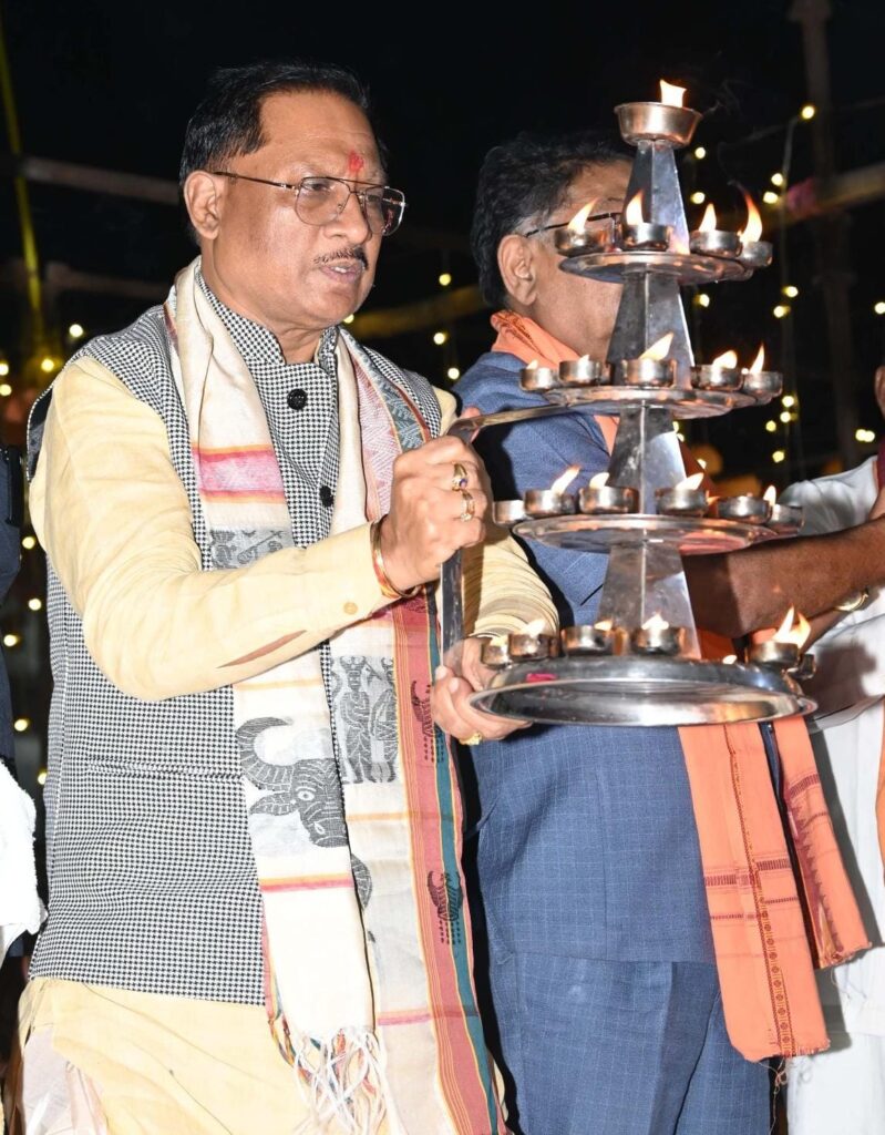 Raipur, // Chief Minister Shri Vishnu Deo Sai on Tuesday participated in the Maa Mahananda Chitrotpala Ganga Mahanadi Mahaarati Mahotsav-2024 held on the banks of the Mahanadi River at Darhaghat, Chandrapur in Sakti district. During the event, he inaugurated the Ganga Aarti at Darhaghat, which was funded through Corporate Social Responsibility (CSR) contributions.