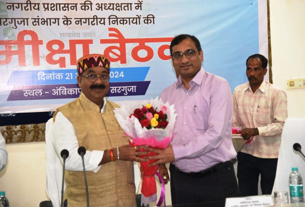 Urban Administration Department Secretary Dr. Basvaraju S., Surguja Collector Shri Bhoskar Vilas Sandipan, Additional Director of Urban Administration Department Shri Pulak Bhattacharya, Joint Director of Ambikapur Regional Office Shri S.K. Sundarani, along with commissioners of all municipal corporations, chief municipal officers of municipalities and nagar panchayats, and engineers from the Surguja division were present.