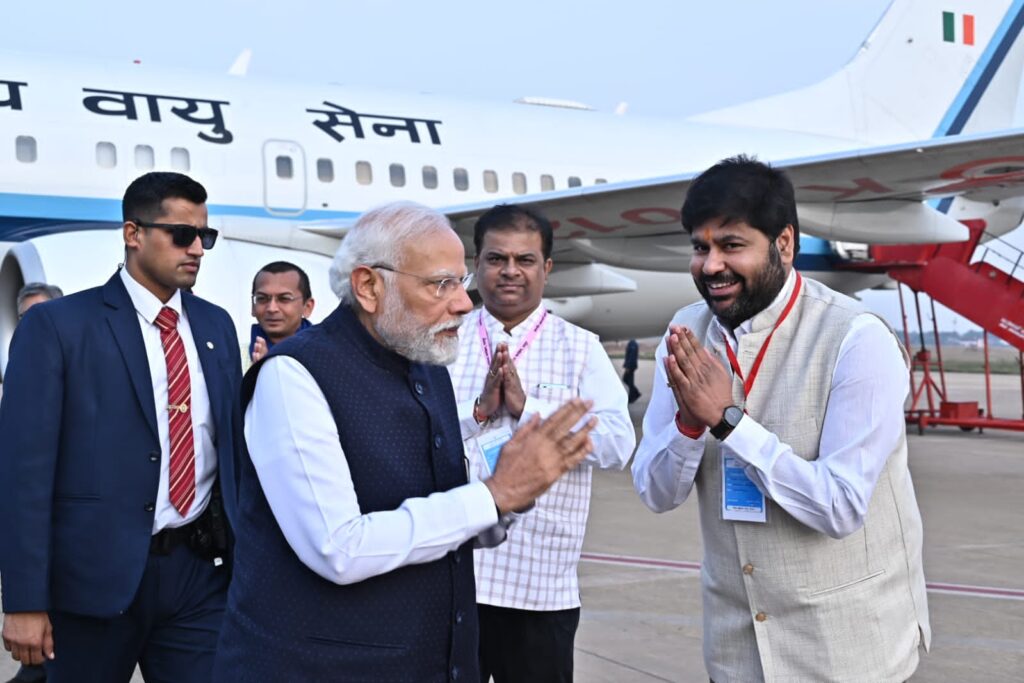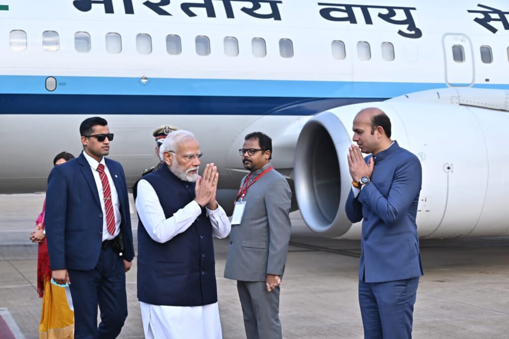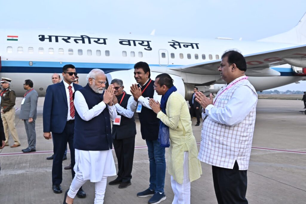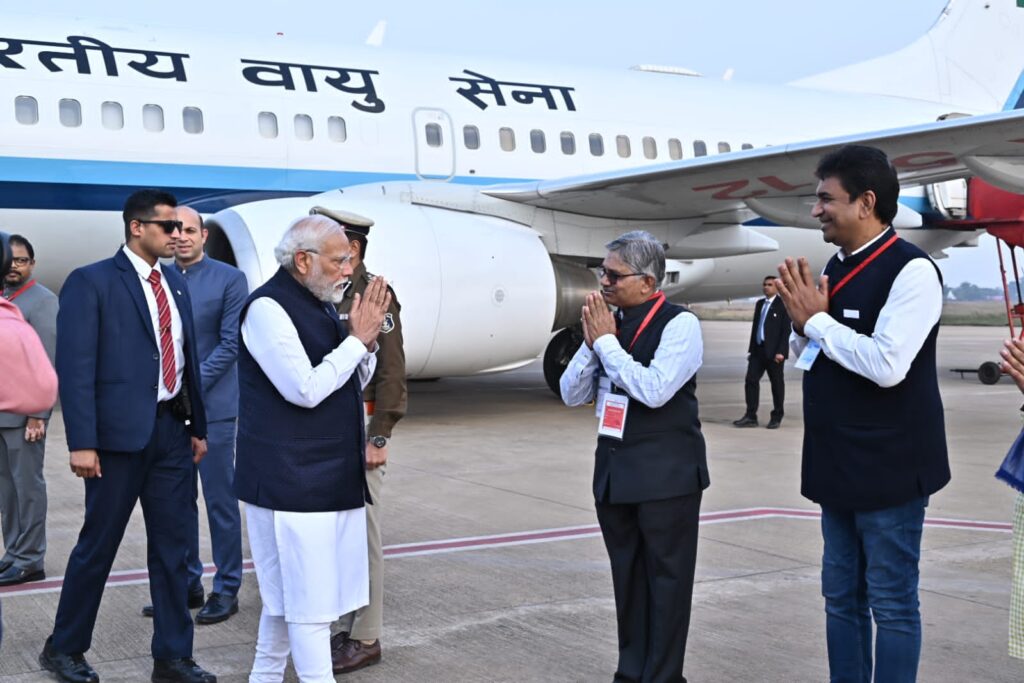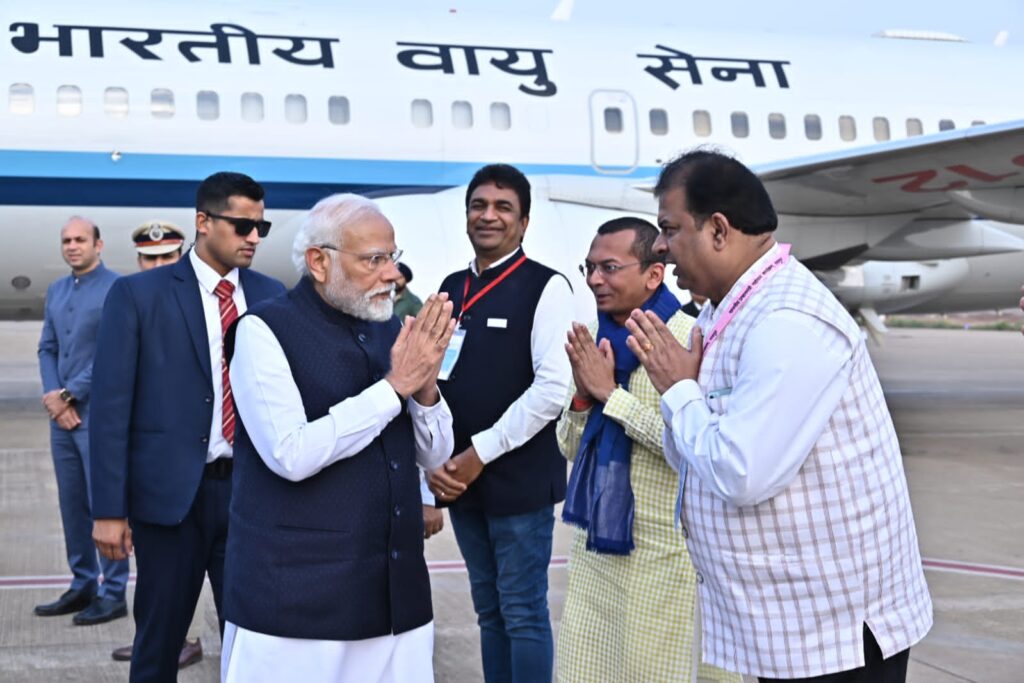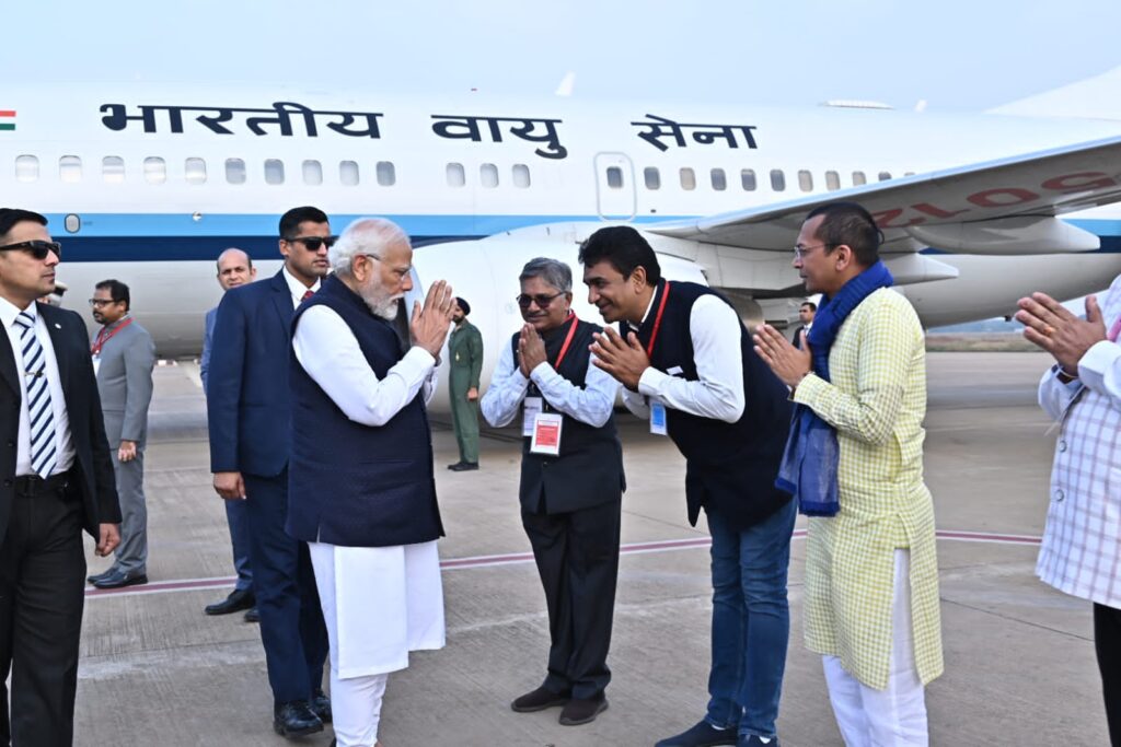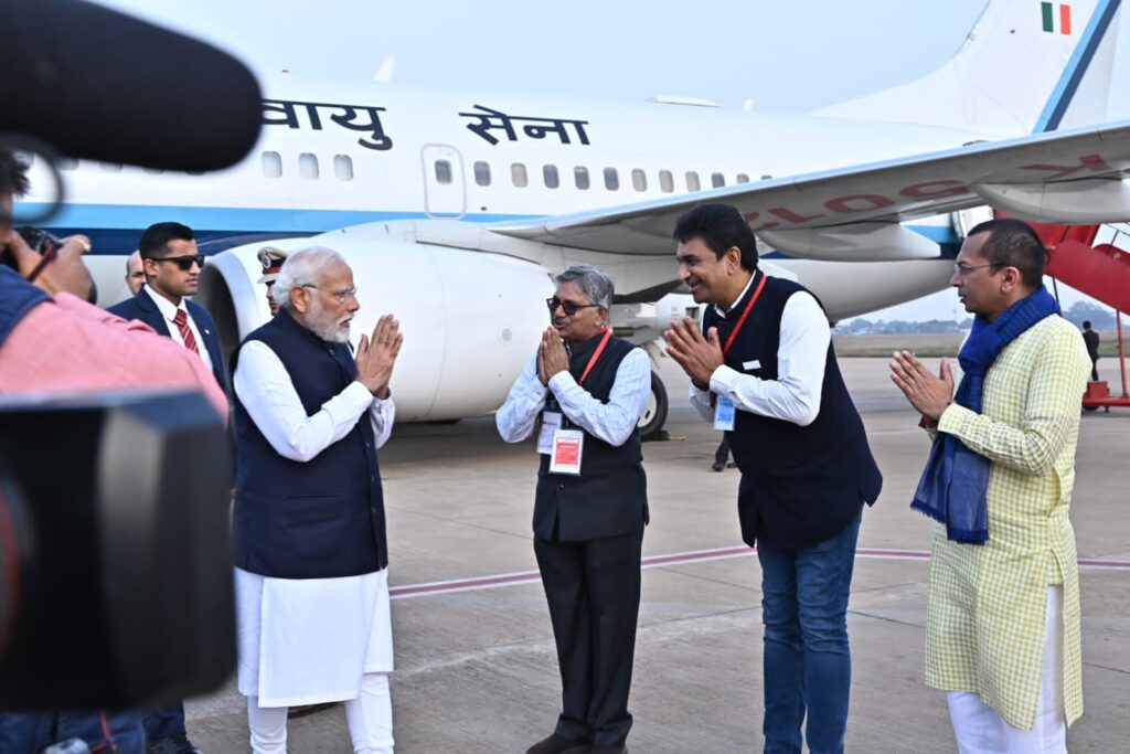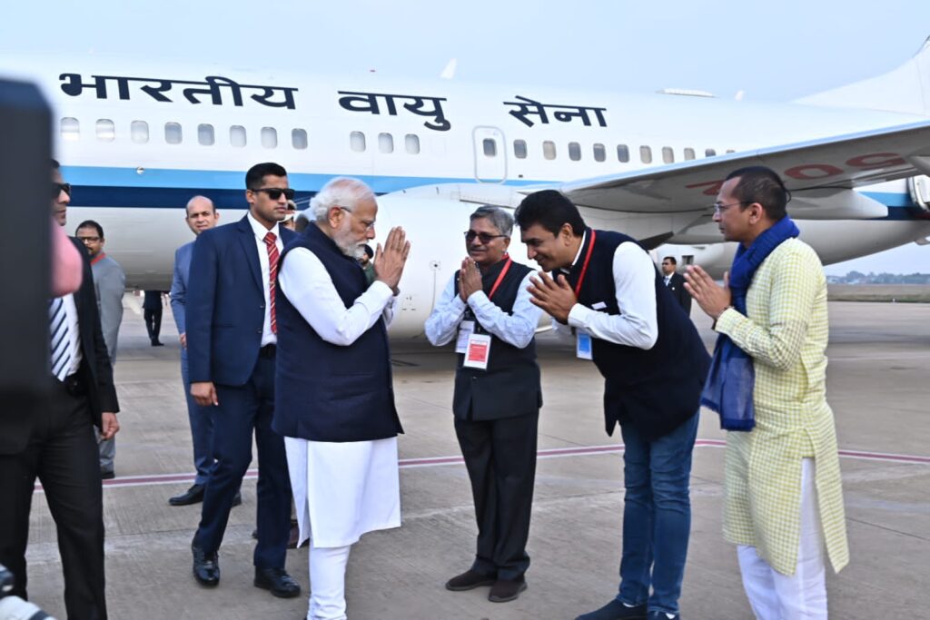 Raipur*Prime Minister Mr. Narendra Modi received a warm welcome at Raipur Airport. Rajya Sabha MP Ms. Saroj Pandey, MP Mr. Santosh Pandey, Director General of Police Mr. Ashok Juneja, Principal Secretary Mr. Manoj Pingua, Collector Dr. Sarveshwar Bhure, SSP Mr. Prashant Agrawal and other distinguished public representatives were present at the airport*