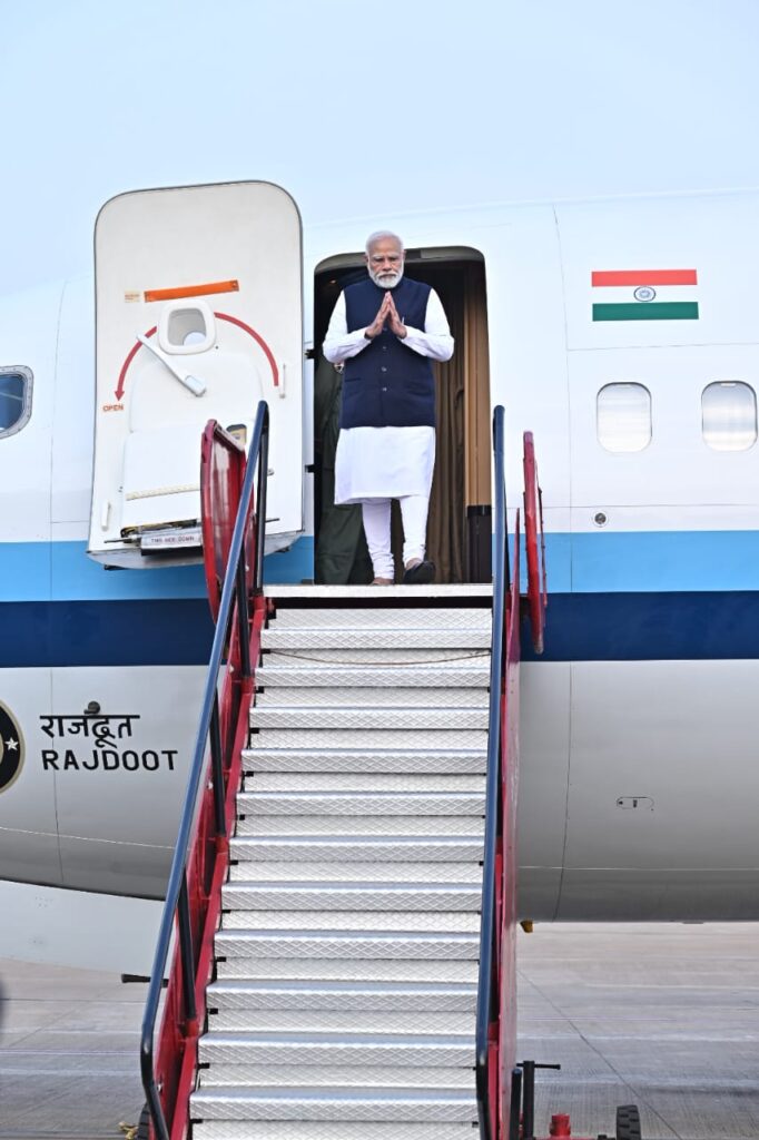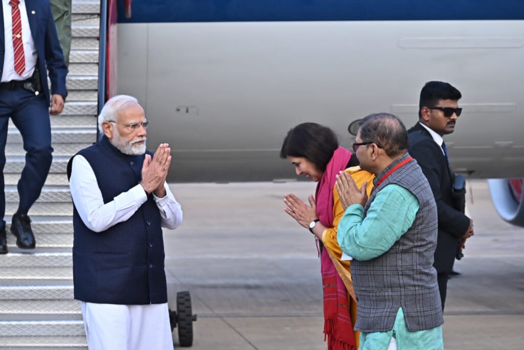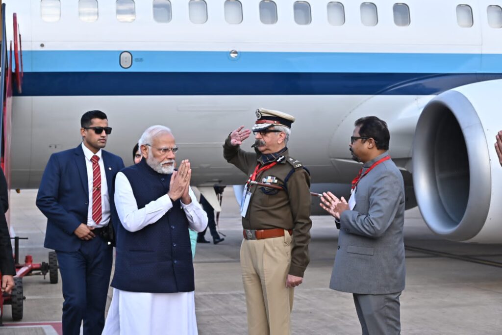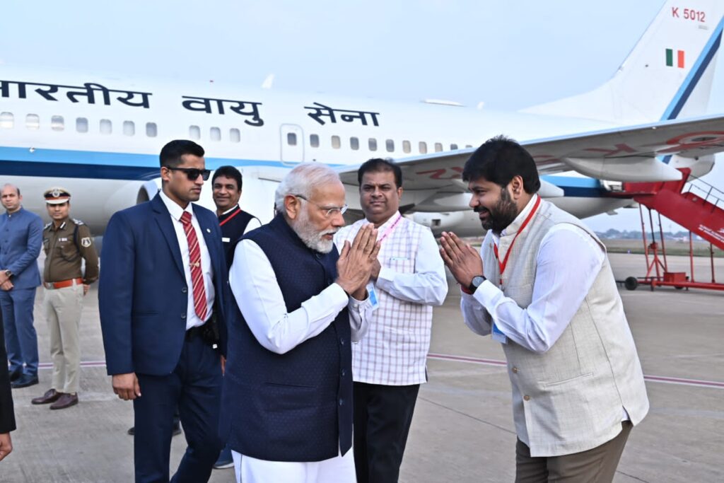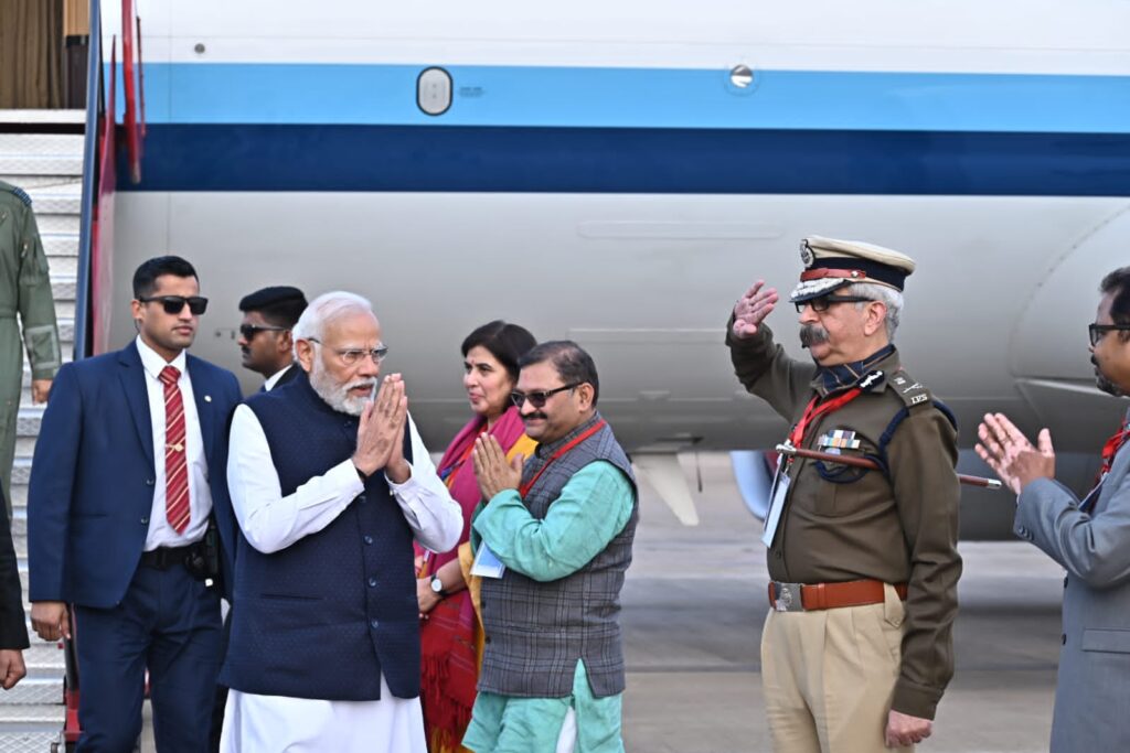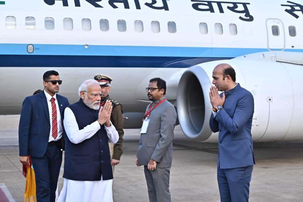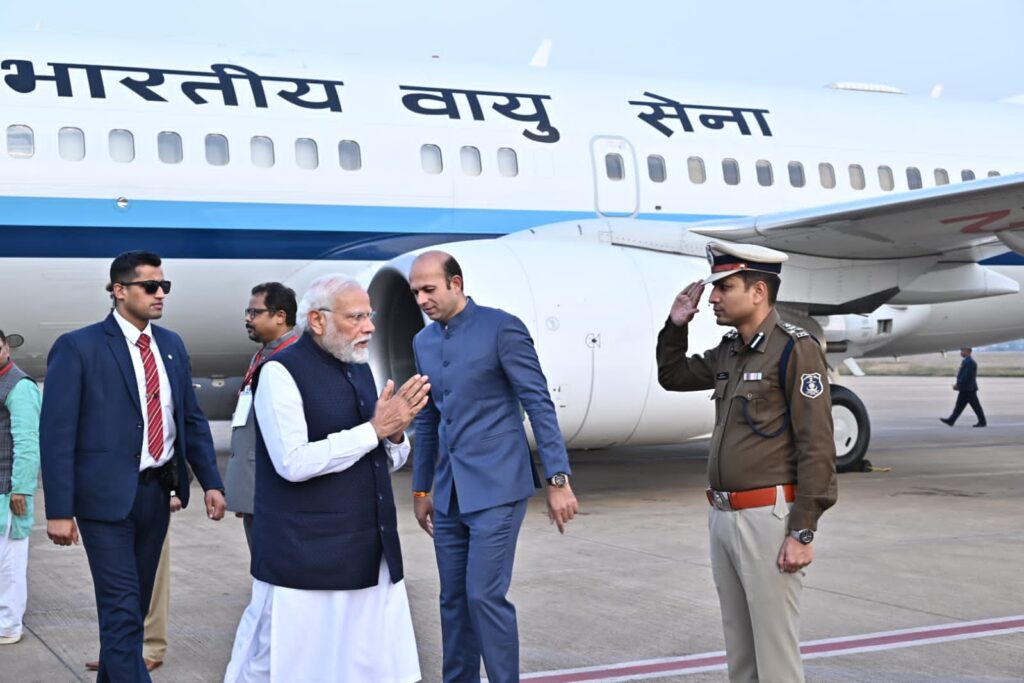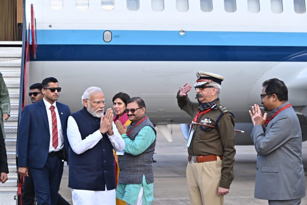 Raipur*Prime Minister Mr. Narendra Modi received a warm welcome at Raipur Airport. Rajya Sabha MP Ms. Saroj Pandey, MP Mr. Santosh Pandey, Director General of Police Mr. Ashok Juneja, Principal Secretary Mr. Manoj Pingua, Collector Dr. Sarveshwar Bhure, SSP Mr. Prashant Agrawal and other distinguished public representatives were present at the airport*